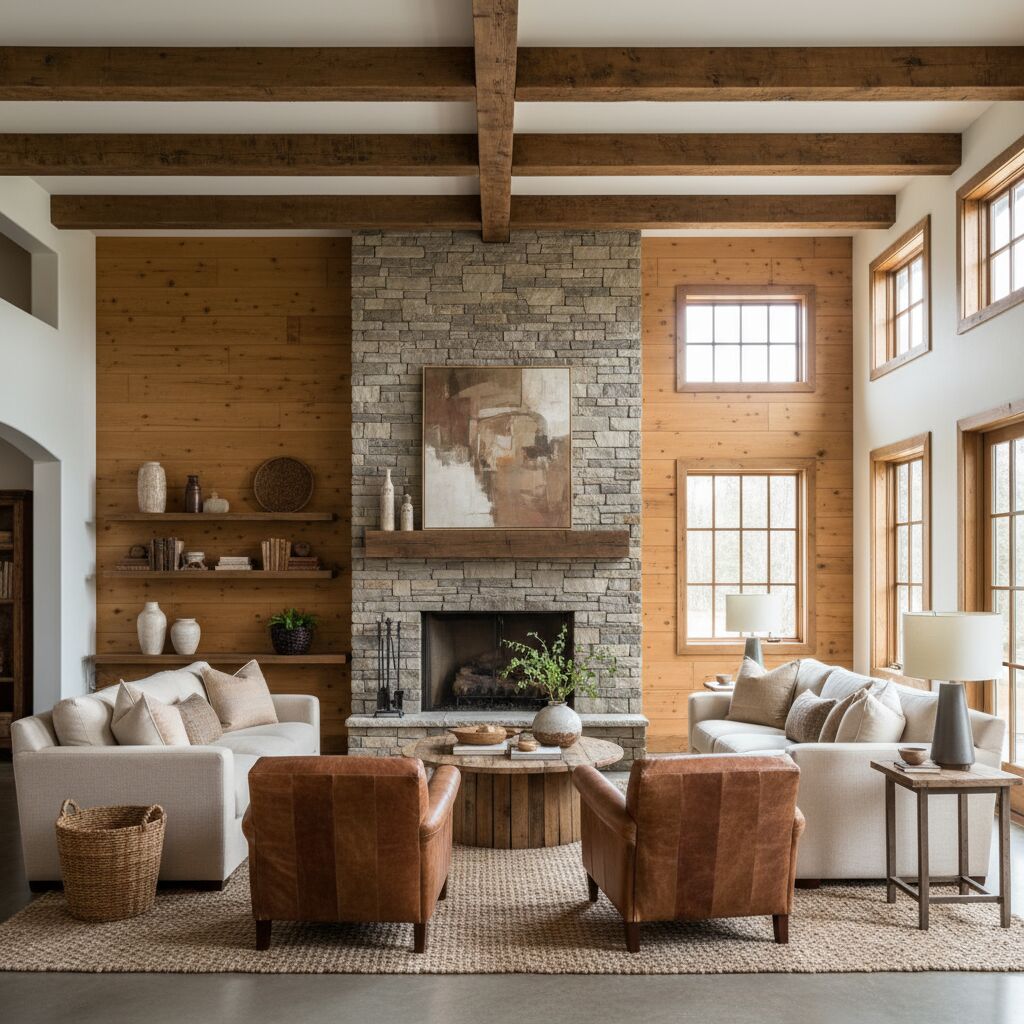 Pour un esprit campagne chic, on accentue les poutres en bois par des teintes chaudes et des parements texturés, tout en gardant un plafond clair pour réfléchir la lumière. Les murs à la chaux, associés à des lames légèrement brossées, composent un décor simple et sincère.